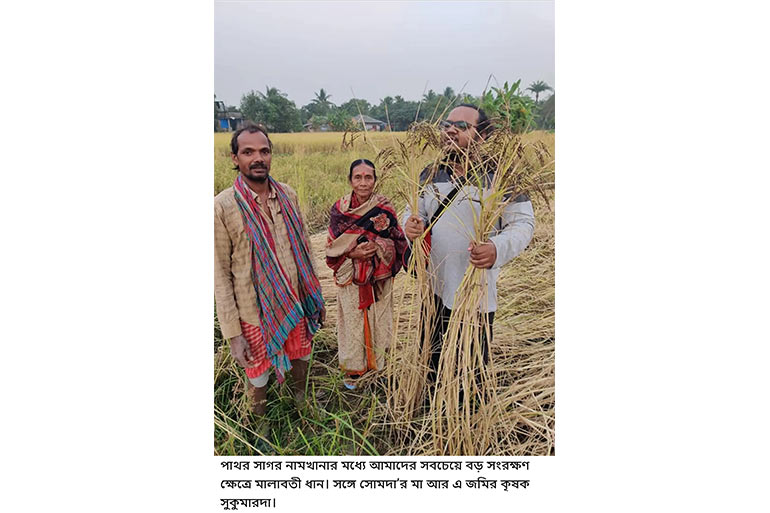 (P.S. – By the time this piece is finished, all the paddy has already been harvested. Starting with 9 farmers, this year we will hand over several varieties of indigenous rice to at least 20 farmers. Primarily, they themselves have chosen the varieties according to the character of their land. For example, in Patharpratima, Bishnuda has chosen Malabati and Khejurchari; in Sagar Island, Shubhashis has chosen Maule; Manasidi has chosen Sitashal for the Aman season and Chomotkar for the Boro season. In this way, year after year, cultivation of indigenous rice must be expanded, plot by plot. Unless agriculture is freed from chemical fertilizers and poisons, our destruction is not far away!)